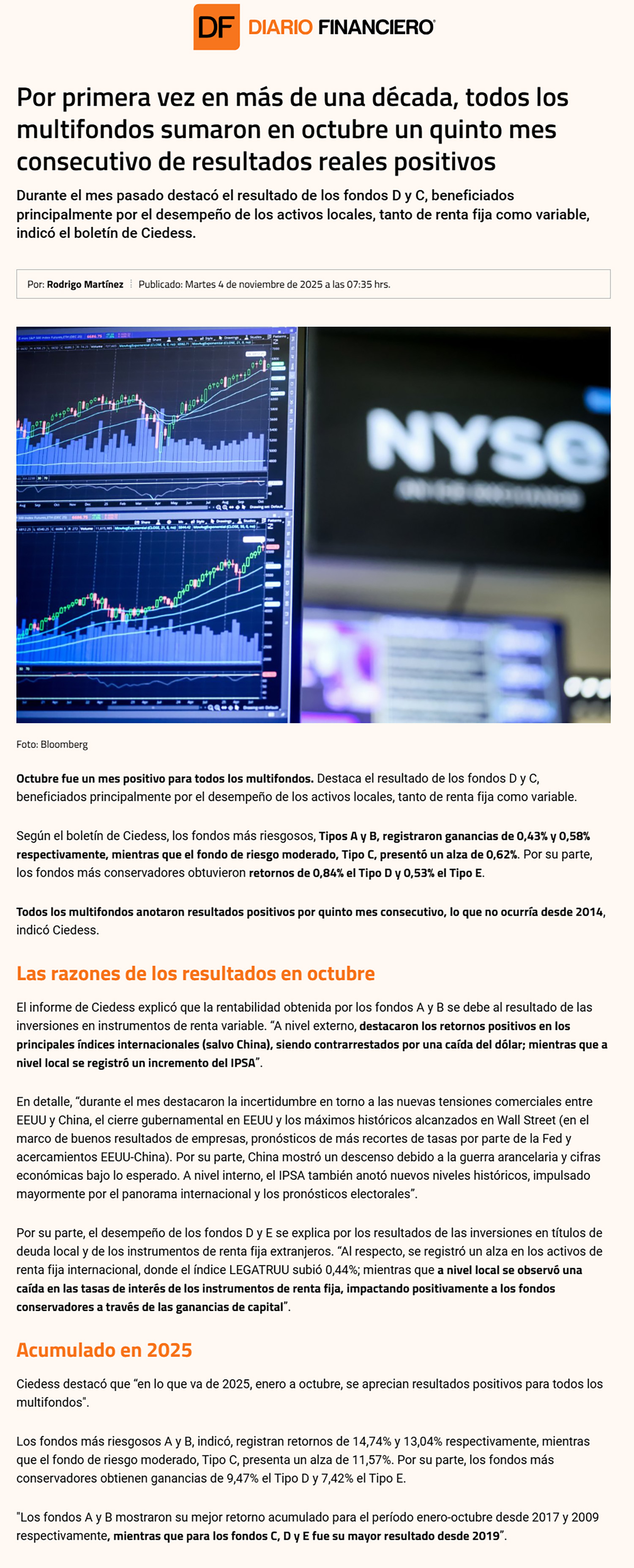 Ciedess destacó que "en lo que va de 2025, enero a octubre, se aprecian resultados positivos para todos los multifondos".