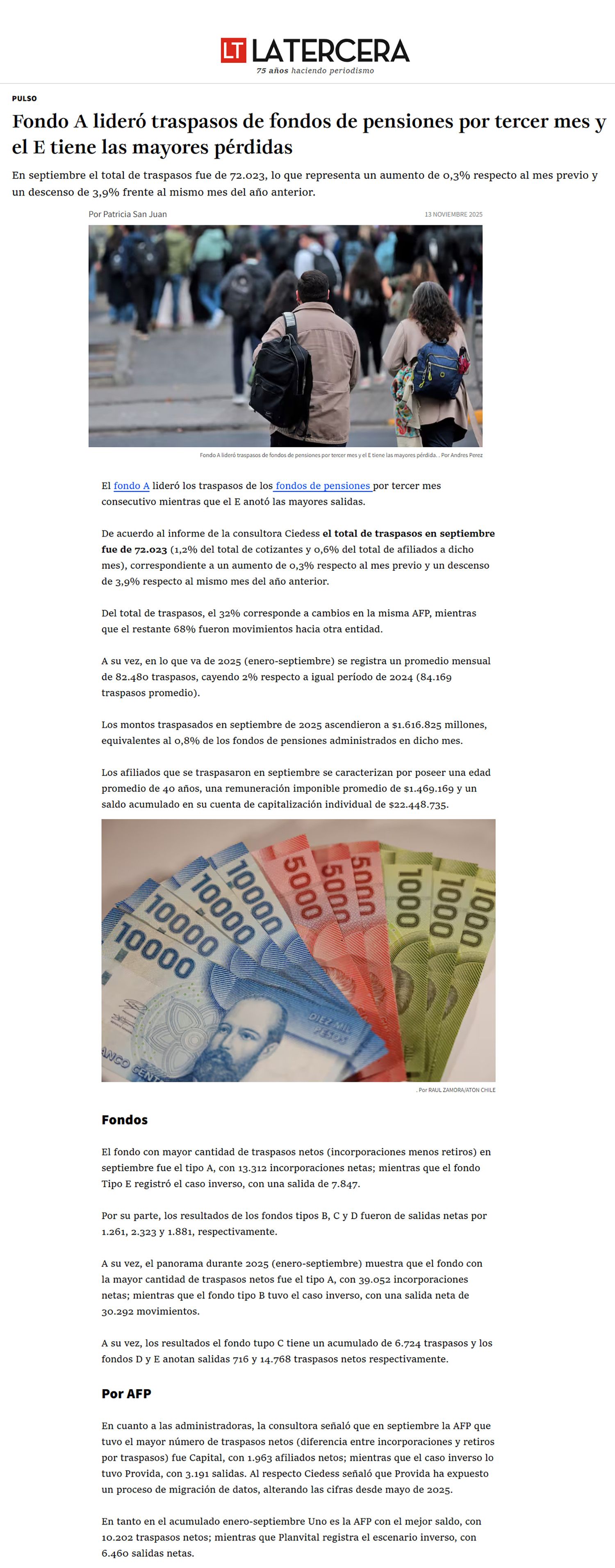 Fuente: La Tercera-PulsoPublicado el 13 de noviembre de 2025.El fondo A lideró los traspasos de los fondos de pensiones por tercer mes consecutivo mientras que el E anotó las mayores salidas.