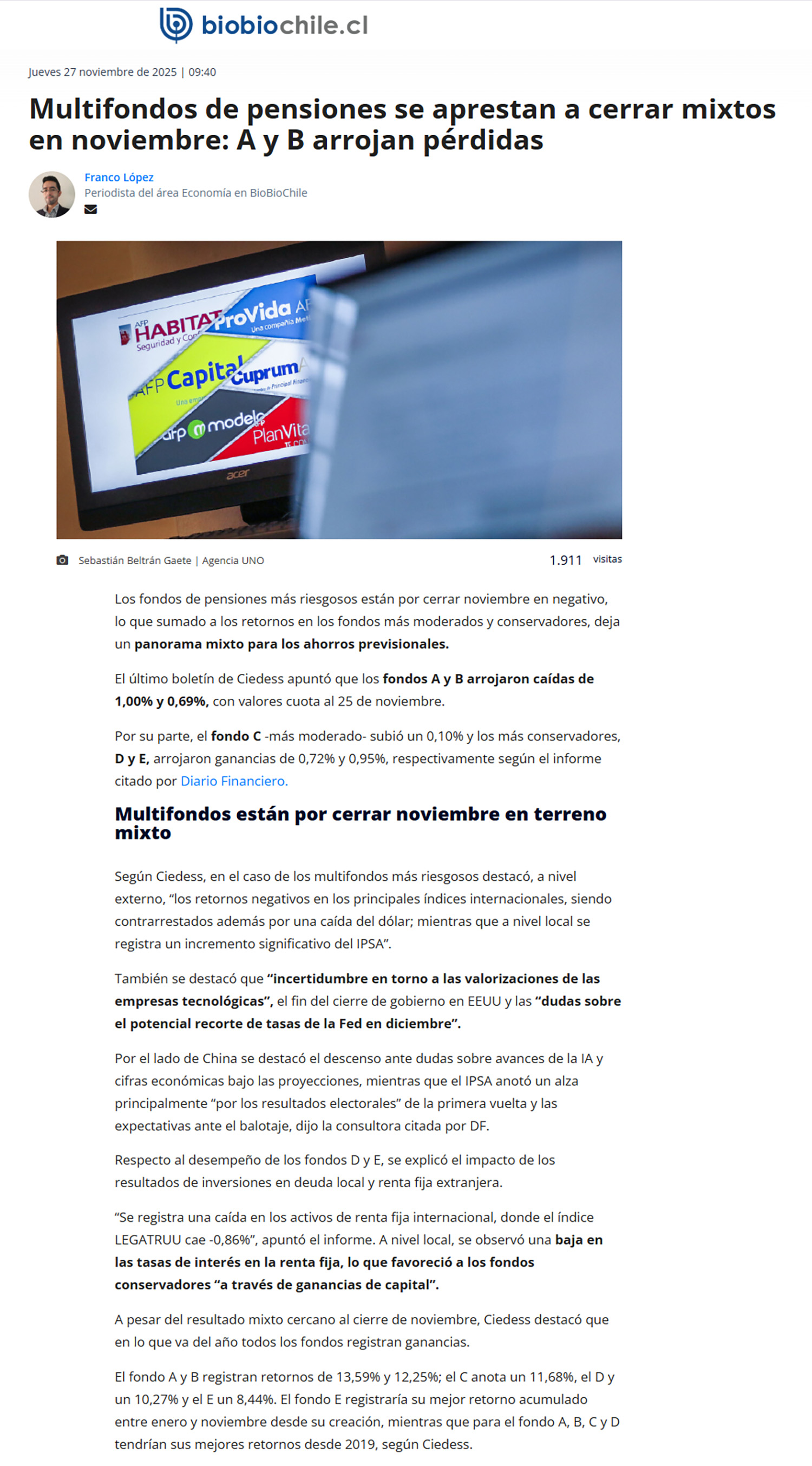 Fuente: Radio BiobioPublicado el 27 de noviembre de 2025.Los fondos de pensiones más riesgosos están por cerrar noviembre en negativo, lo que sumado a los retornos en los fondos más moderados y conservadores, deja un panorama mixto para los ahorros previsionales.