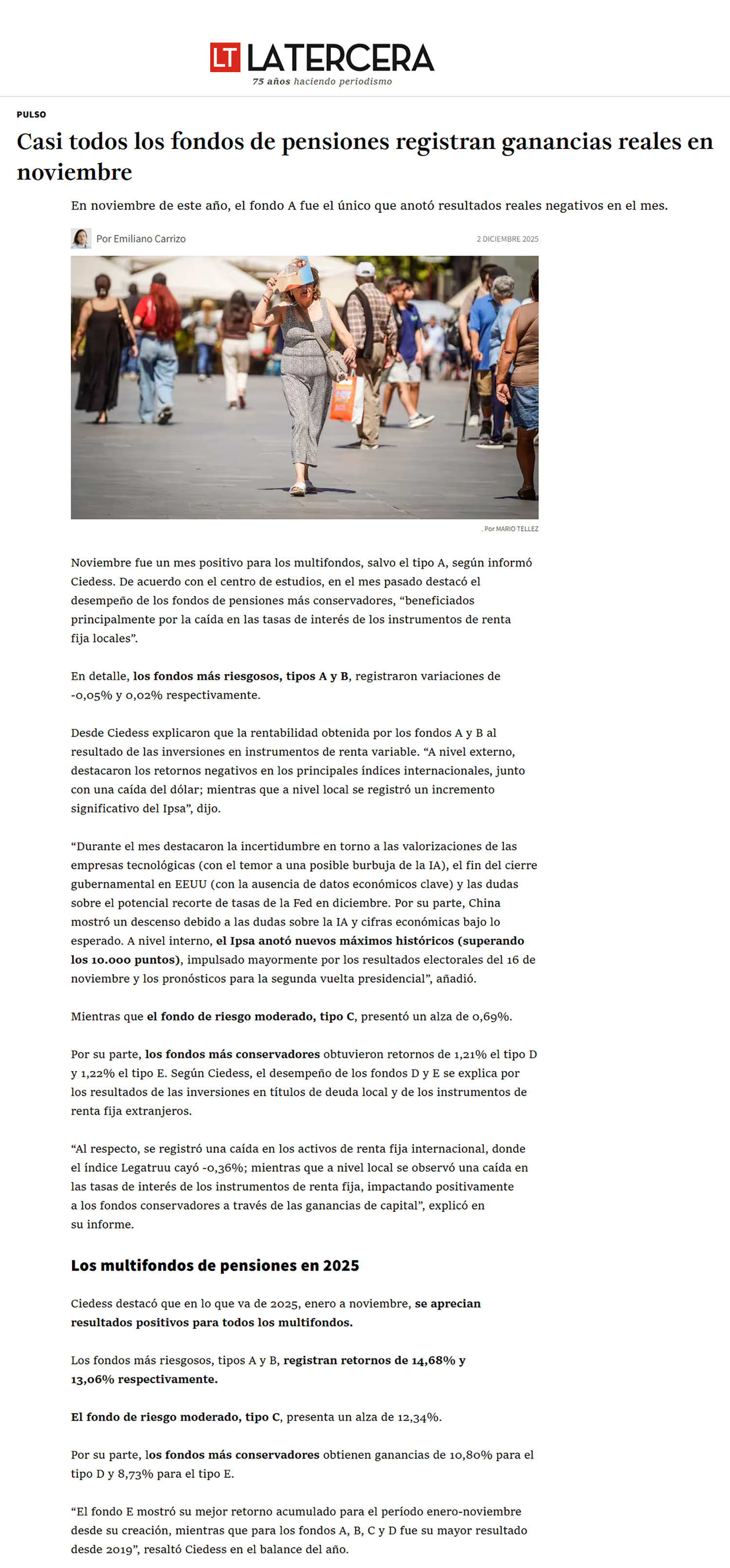 Fuente: La Tercera-PulsoPublicado el 02 de diciembre de 2025.Noviembre fue un mes positivo para los multifondos, salvo el tipo A, según informó Ciedess. De acuerdo con el centro de estudios, en el mes pasado destacó el desempeño de los fondos de pensiones más conservadores, "beneficiados principalmente por la caída en las tasas de interés de los instrumentos de renta fija locales".