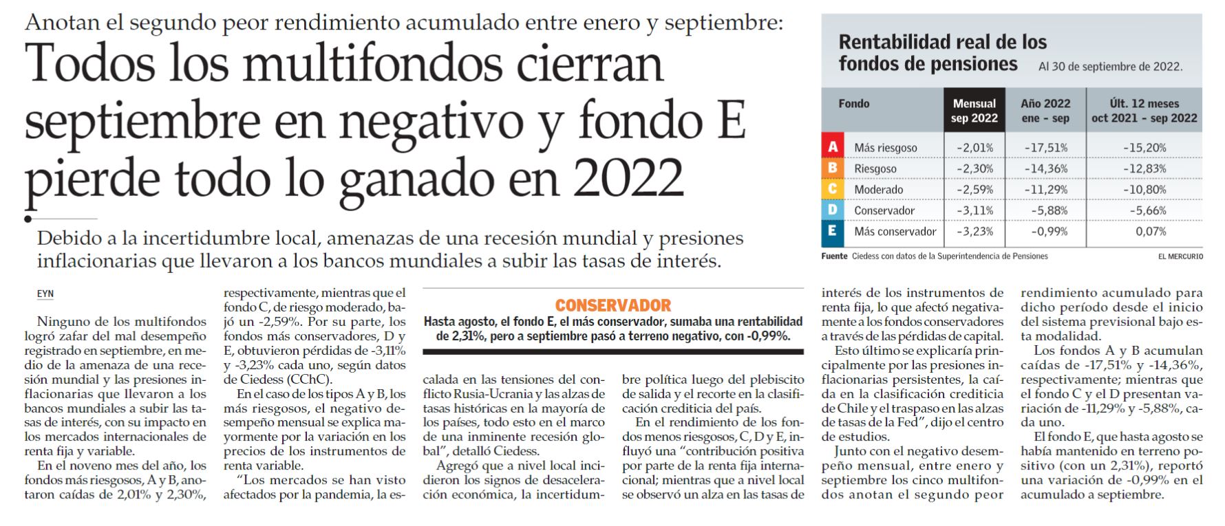 Ciedess en El Mercurio: Todos los multifondos cierran septiembre en negativo y fondo E pierde todo lo ganado en 2022