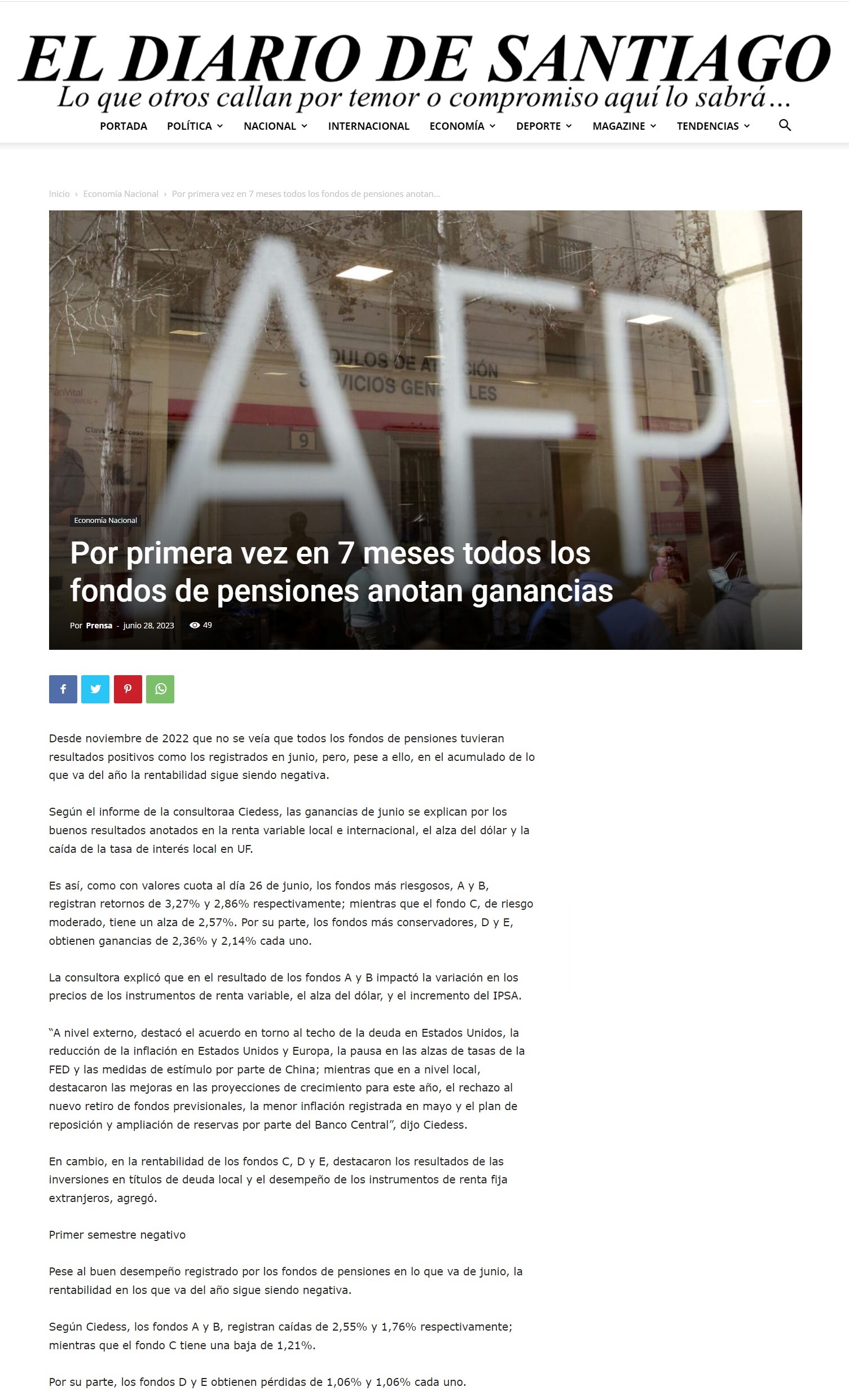 Ciedess en El Diario de Santiago: Por primera vez en 7 meses todos los fondos de pensiones anotan ganancias