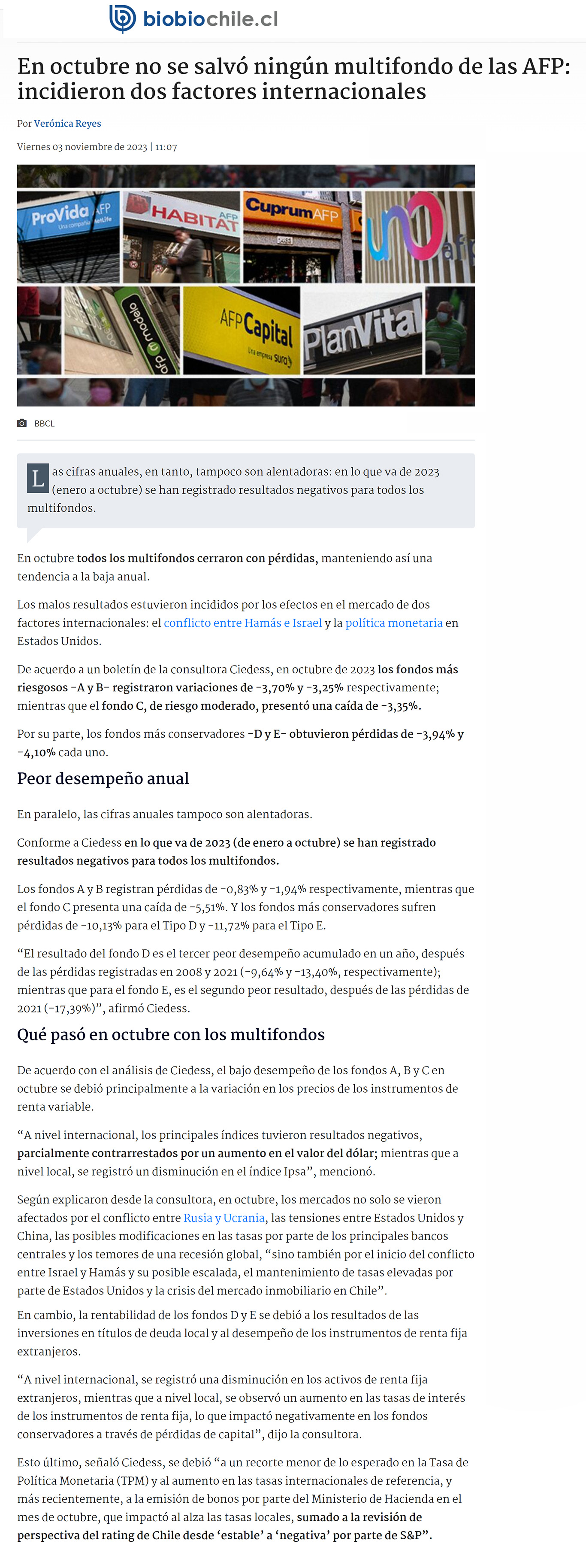 Fuente: Radio BiobíoPublicado el 03 de noviembre de 2023.En octubre todos los multifondos cerraron con pérdidas, manteniendo así una tendencia a la baja anual.