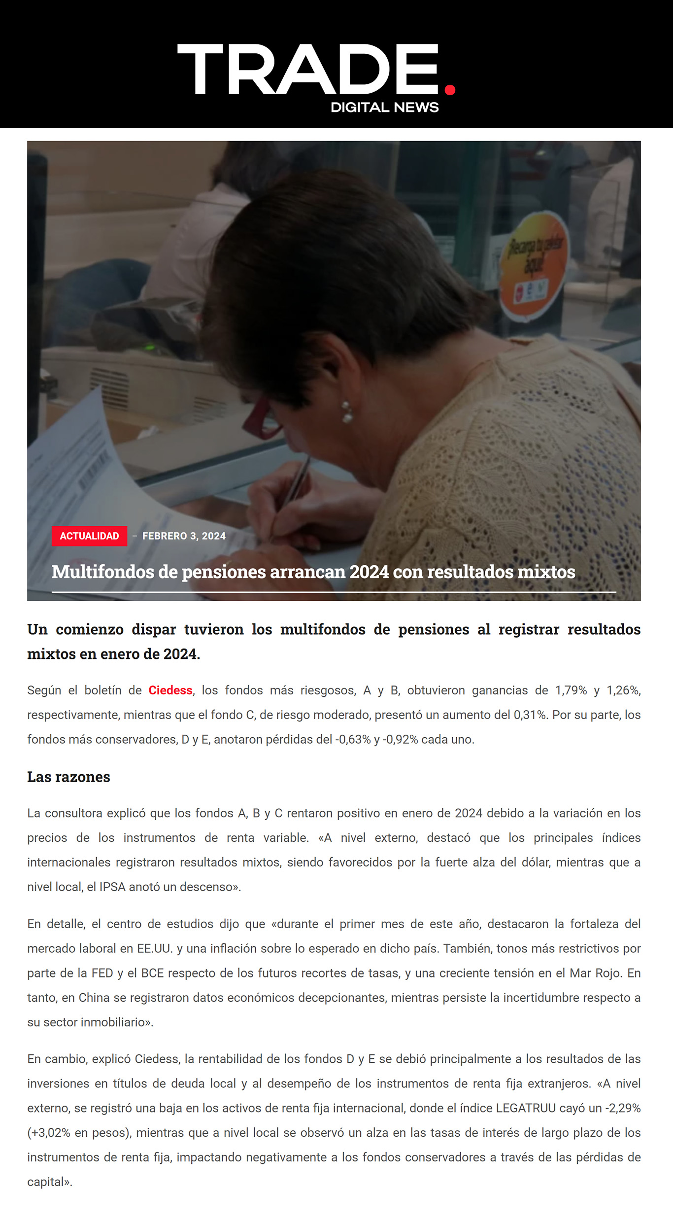 Ciedess en Trade Digital News: Multifondos de pensiones arrancan 2024 con resultados mixtos