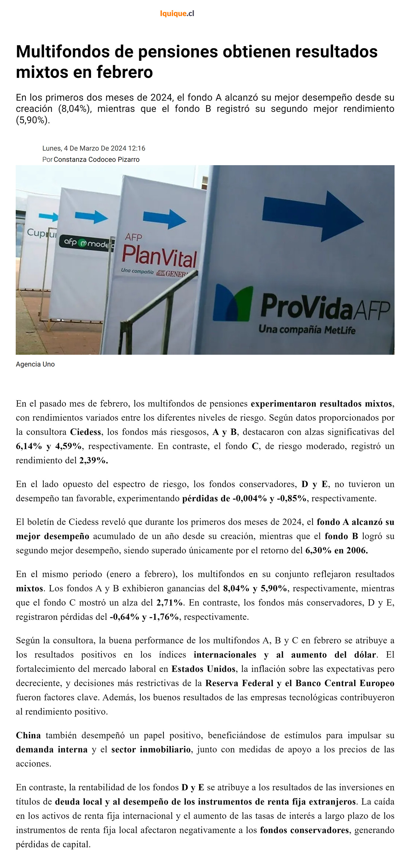 Ciedess en Iquique.cl: Multifondos de pensiones obtienen resultados mixtos en febrero