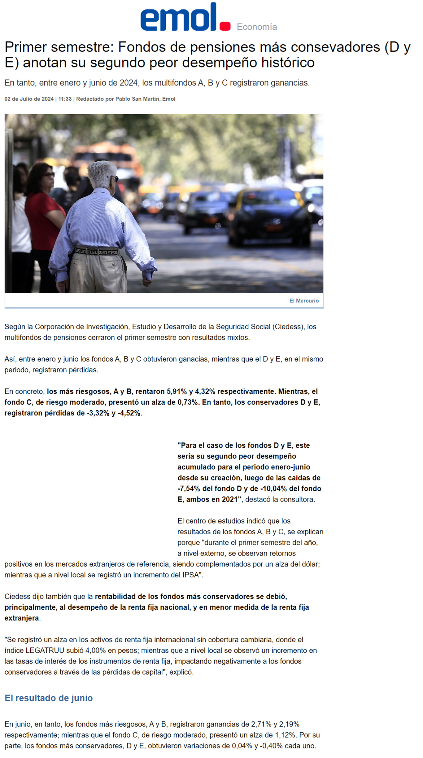Ciedess en Emol: Primer semestre: Fondos de pensiones más consevadores (D y E) anotan su segundo peor desempeño histórico