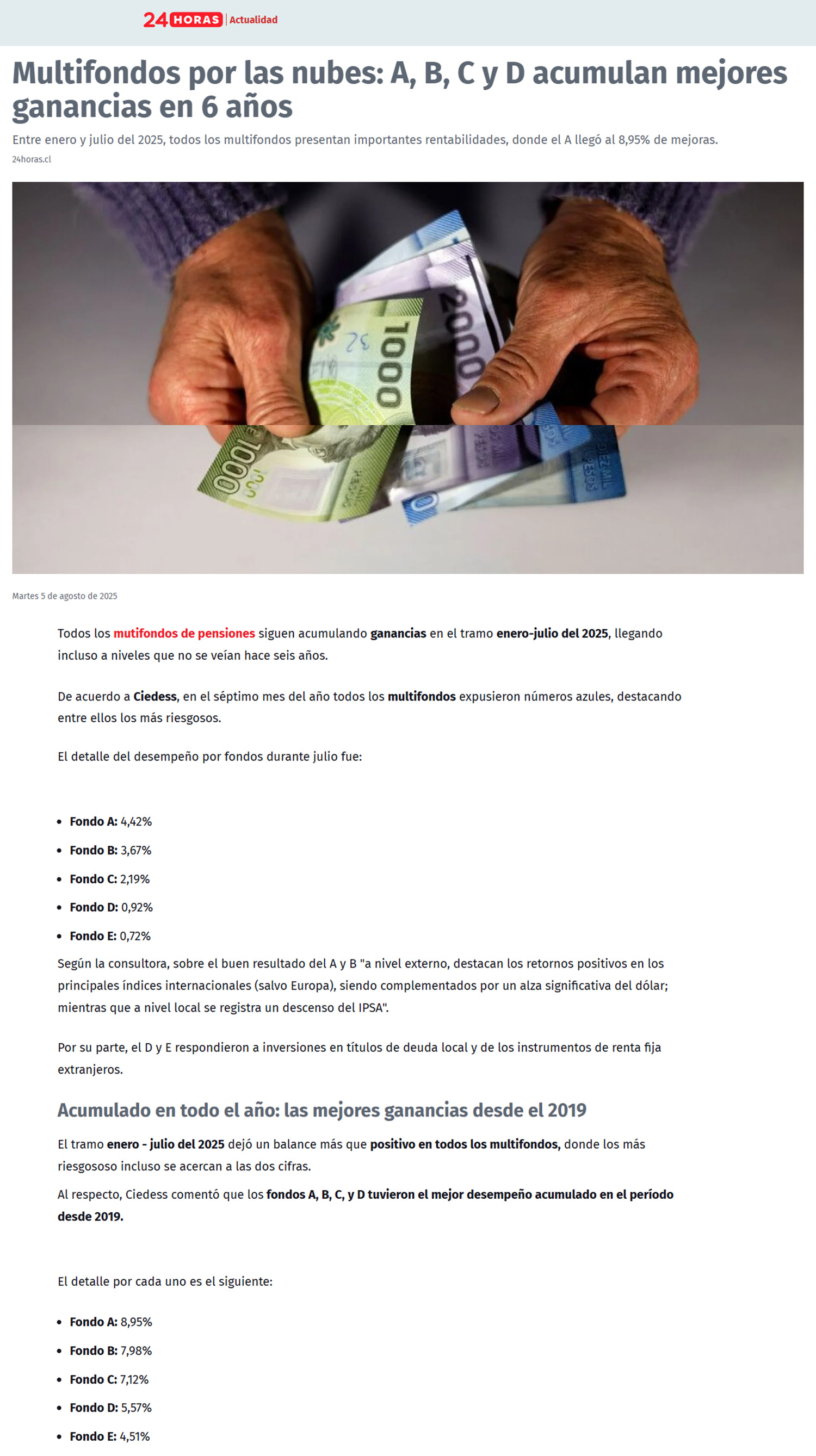 Fuente: 24 Horas onlinePublicado el 05 de agosto de 2025.Todos los mutifondos de pensiones siguen acumulando ganancias en el tramo enero-julio del 2025, llegando incluso a niveles que no se veían hace seis años.