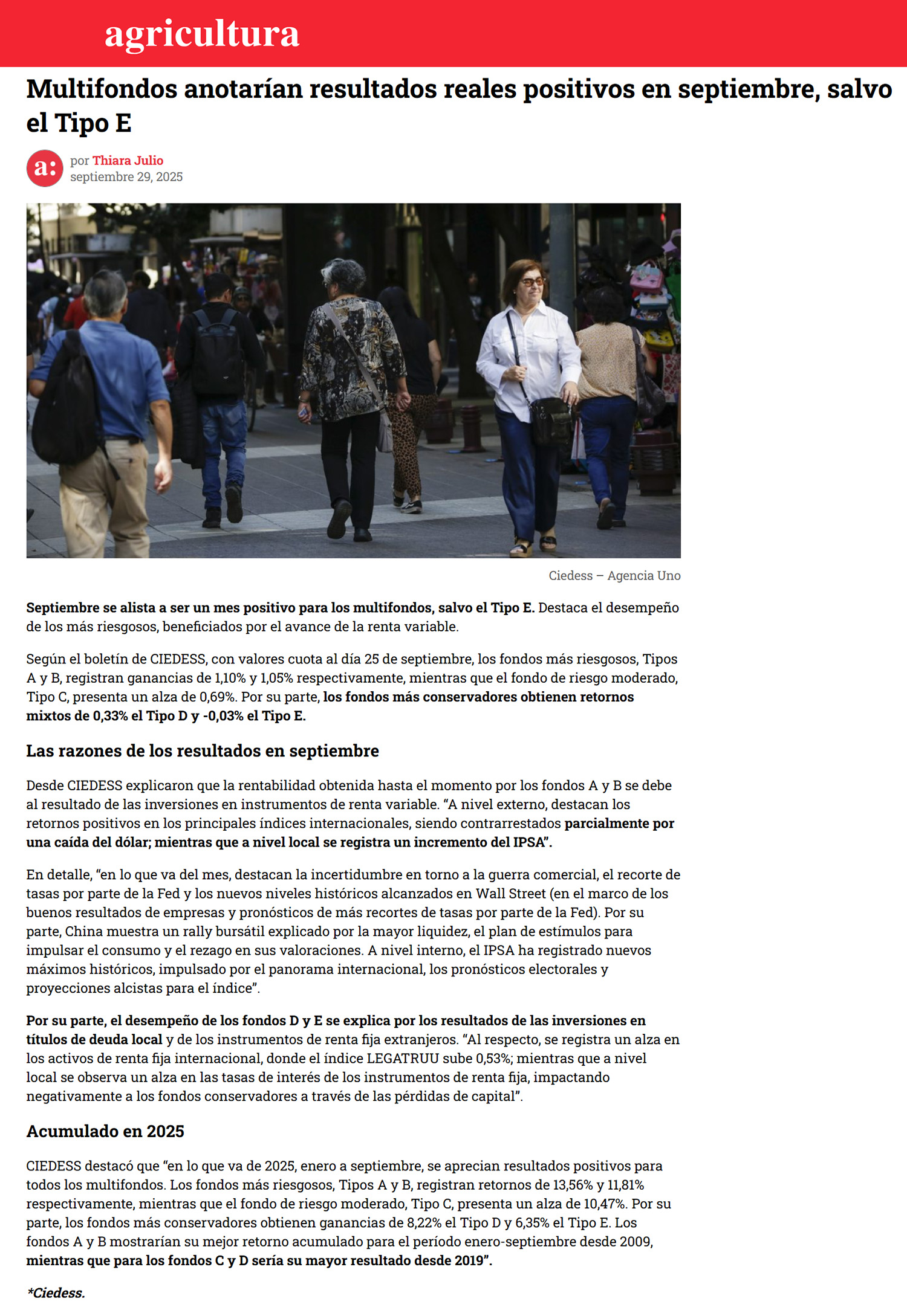 Fuente: Radio AgriculturaPublicado el 29 de septiembre de 2025.Septiembre se alista a ser un mes positivo para los multifondos, salvo el Tipo E. Destaca el desempeño de los más riesgosos, beneficiados por el avance de la renta variable.
