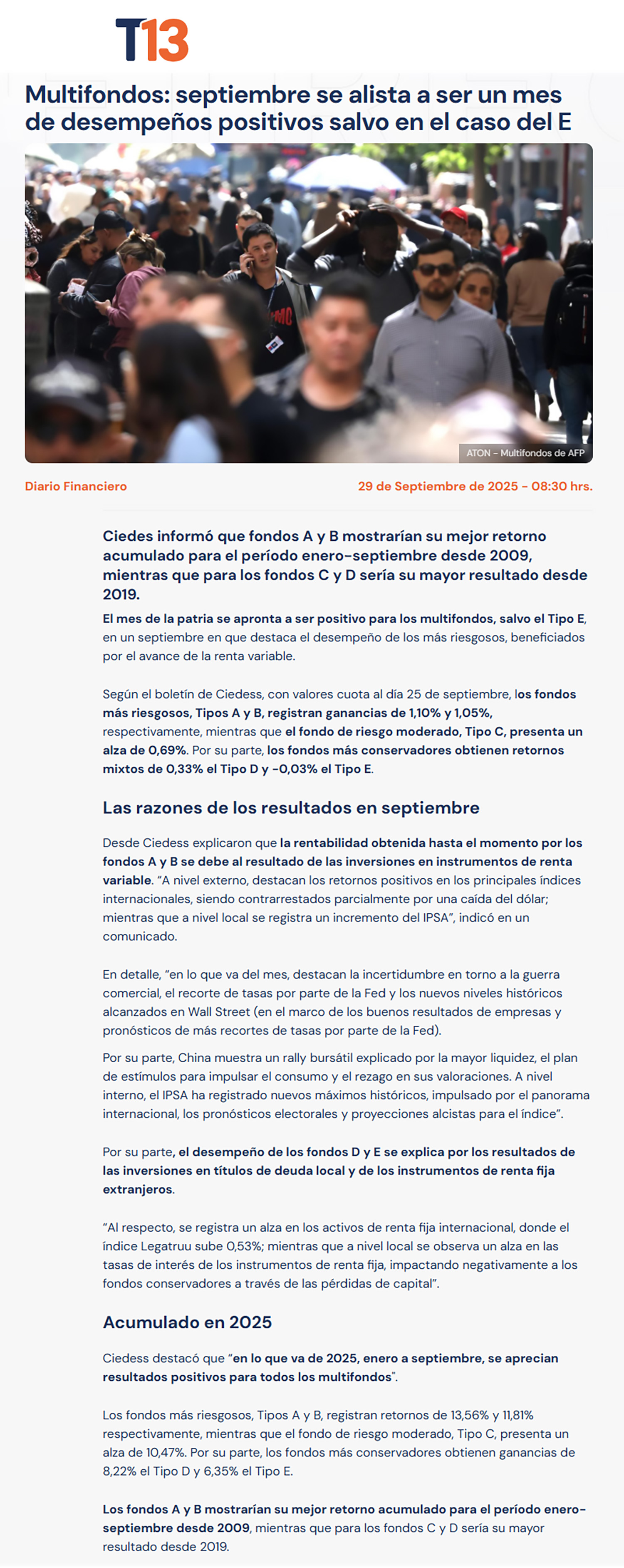 Fuente: T13Publicado el 29 de septiembre de 2025.El mes de la patria se apronta a ser positivo para los multifondos, salvo el Tipo E, en un septiembre en que destaca el desempeño de los más riesgosos, beneficiados por el avance de la renta variable.
