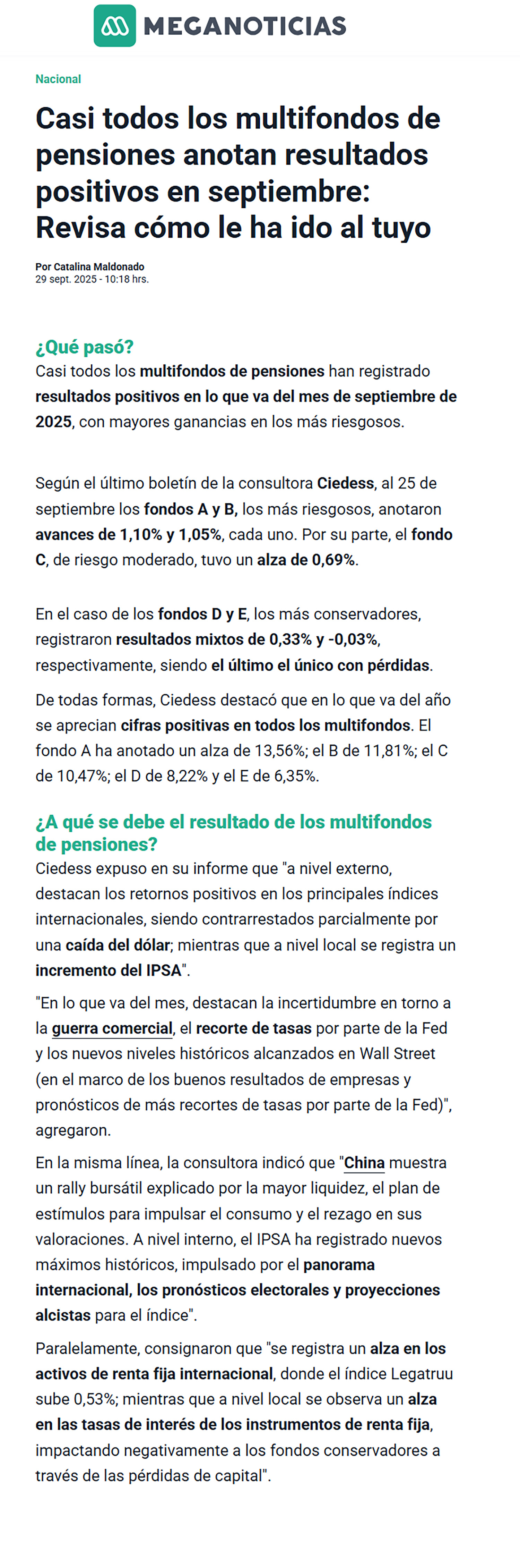 Meganoticias: Casi todos los multifondos de pensiones anotan resultados positivos en septiembre: Revisa cómo le ha ido al tuyo