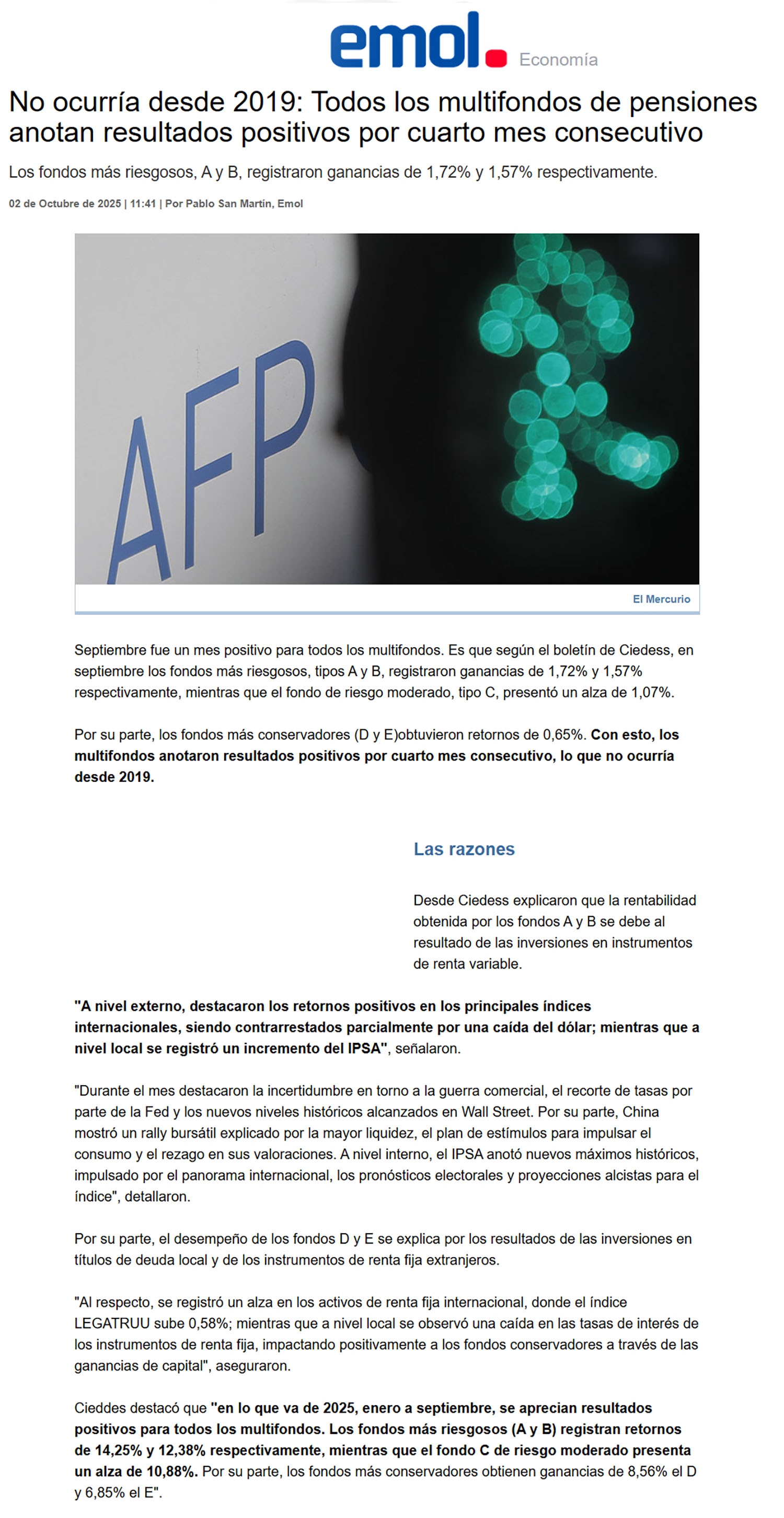 Fuente: EmolPublicado el 02 de octubre de 2025.Septiembre fue un mes positivo para todos los multifondos. Es que según el boletín de Ciedess, en septiembre los fondos más riesgosos, tipos A y B, registraron ganancias de 1,72% y 1,57% respectivamente, mientras que el fondo de riesgo moderado, tipo C, presentó un alza de 1,07%.