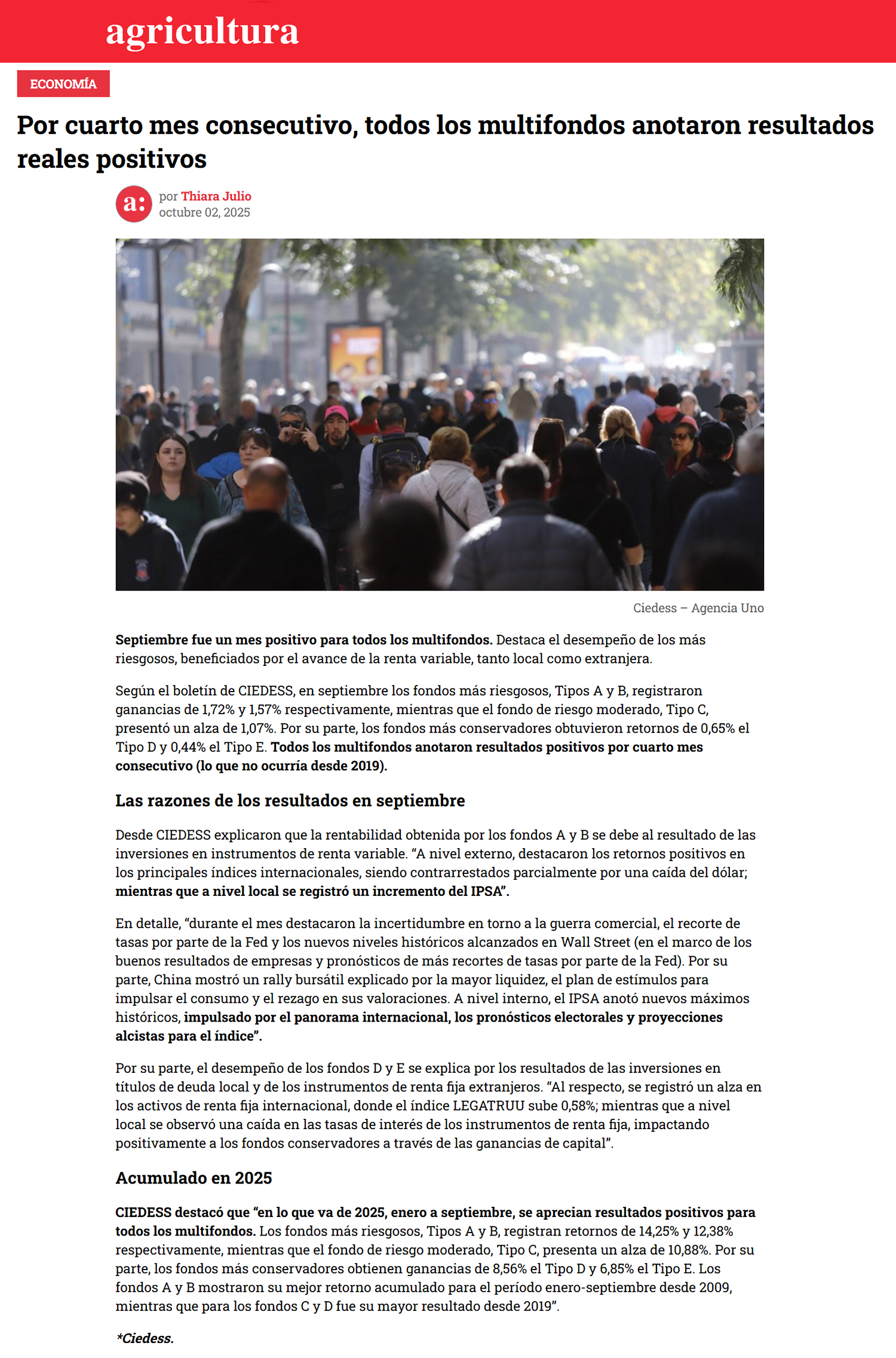 Fuente: Radio AgriculturaPublicado el 02 de octubre de 2025.Septiembre fue un mes positivo para todos los multifondos. Destaca el desempeño de los más riesgosos, beneficiados por el avance de la renta variable, tanto local como extranjera.