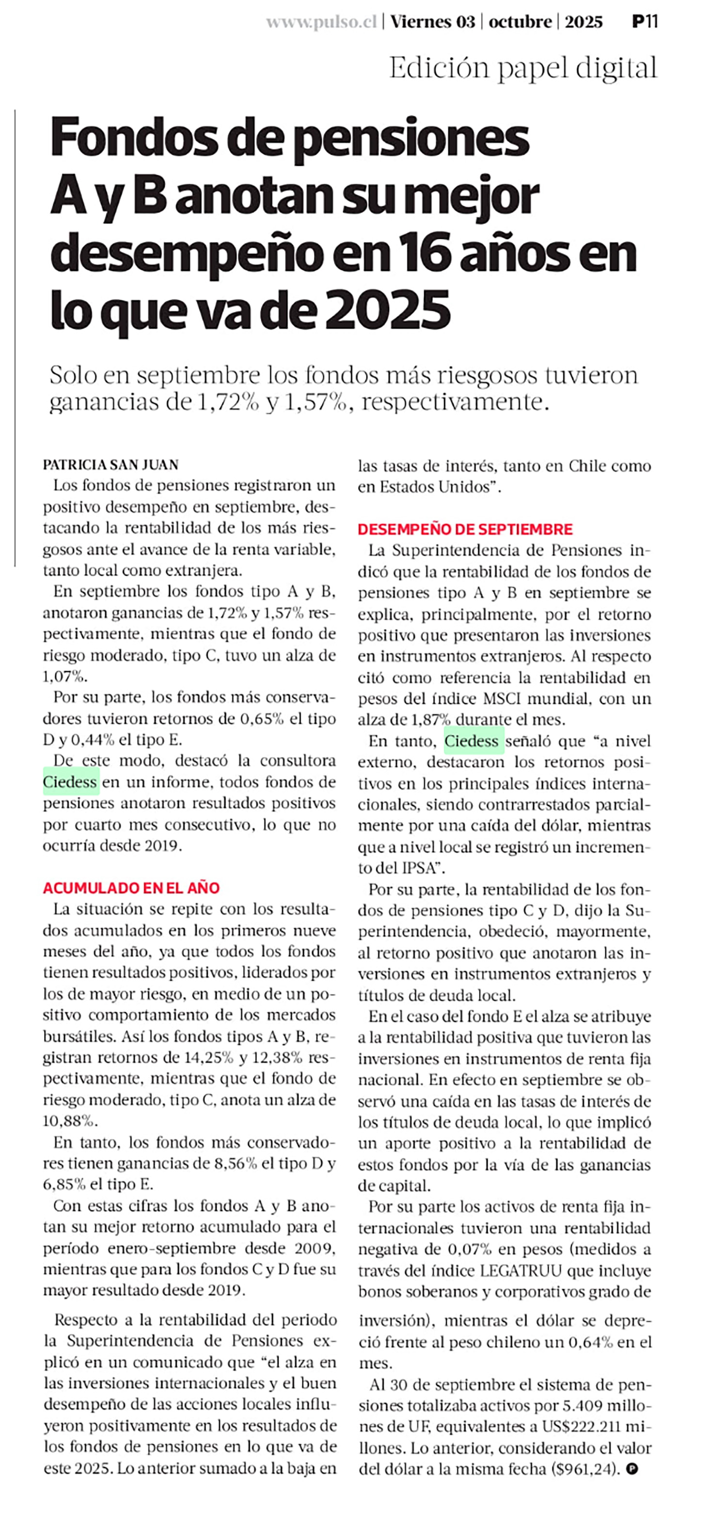 Fuente: La Tercera- PulsoPublicado el 03 de octubre de 2025.Los fondos de pensiones registraron un positivo desempeño en septiembre, destacando la rentabilidad de los más riesgosos ante el avance de la renta variable, tanto local como extranjera.
