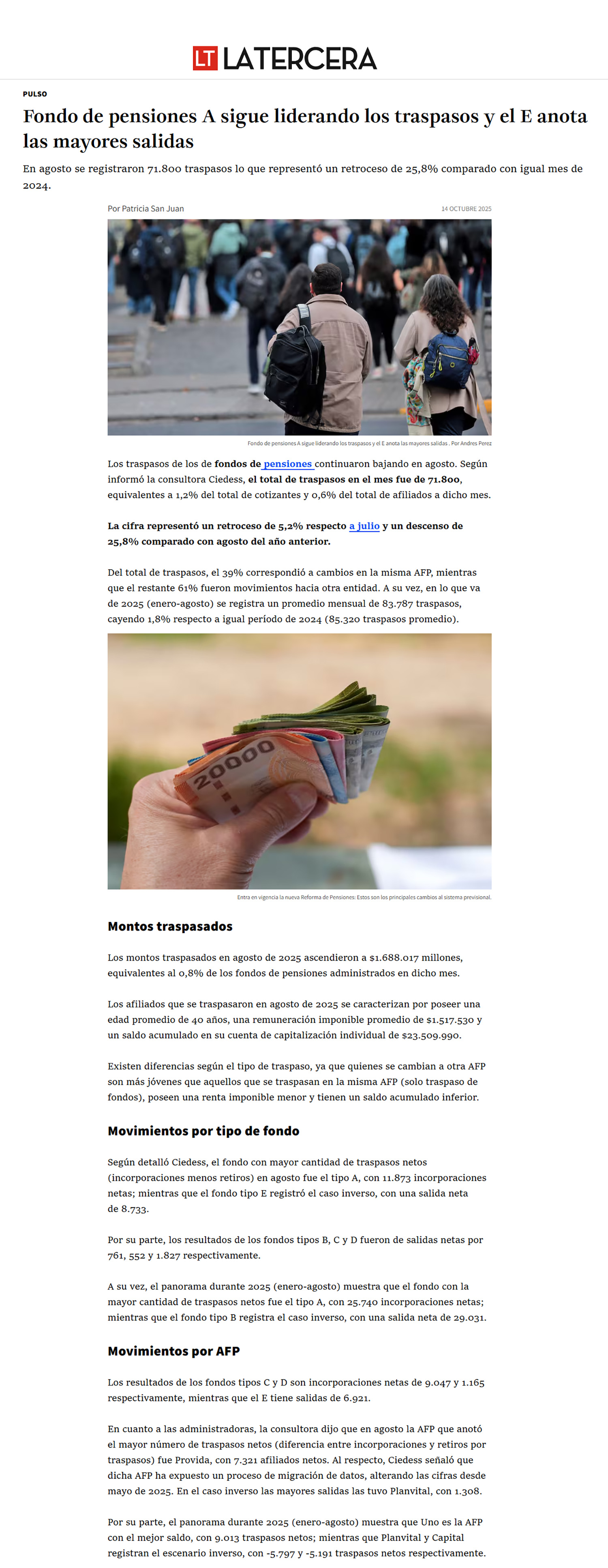 Fuente: La Tercera- PulsoPublicado el 14 de octubre de 2025.Los traspasos de los de fondos de pensiones continuaron bajando en agosto. Según informó la consultora Ciedess, el total de traspasos en el mes fue de 71.800, equivalentes a 1,2% del total de cotizantes y 0,6% del total de afiliados a dicho mes.