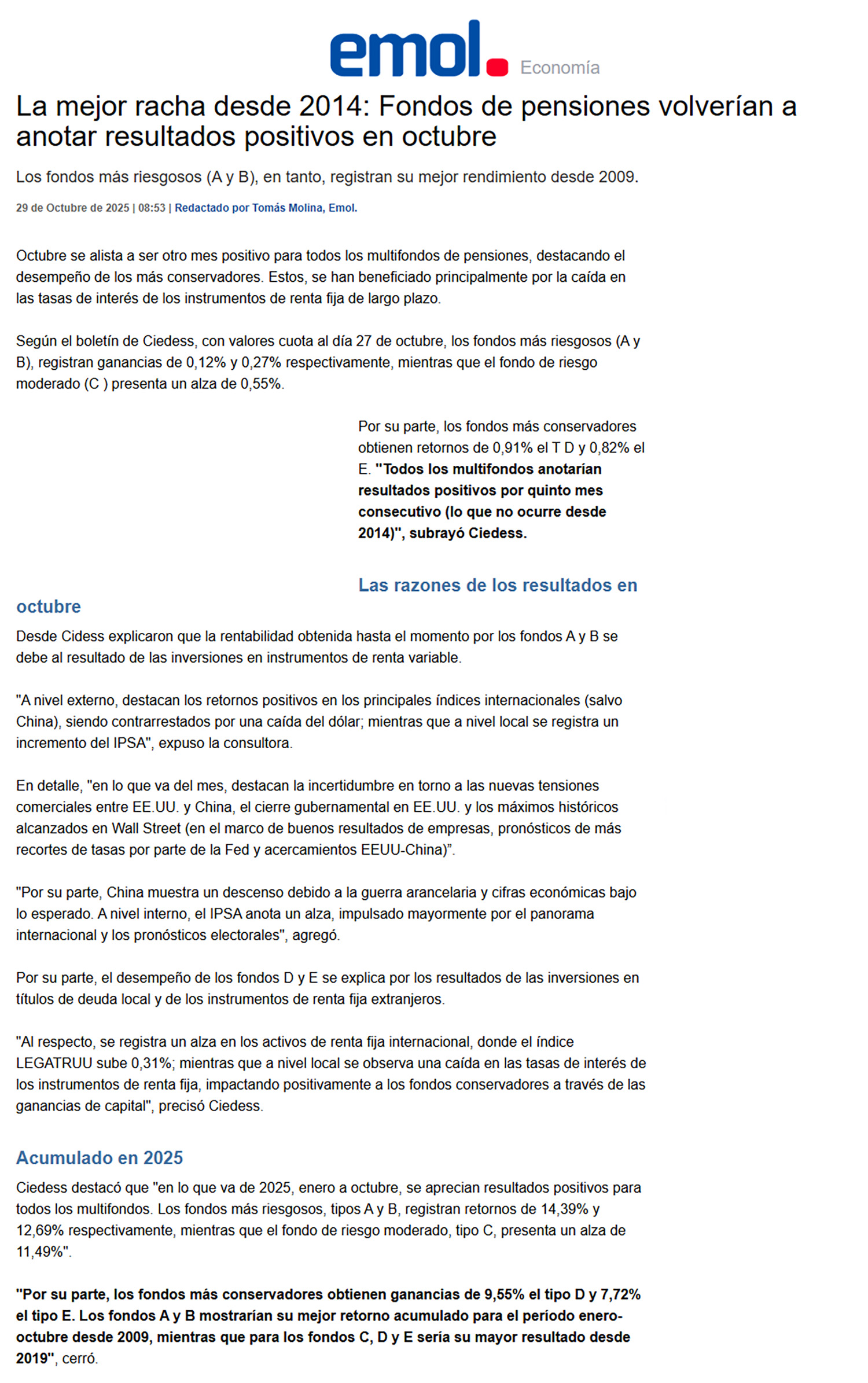 Fuente: EmolPublicado el 29 de octubre de 2025.Octubre se alista a ser otro mes positivo para todos los multifondos de pensiones, destacando el desempeño de los más conservadores. Estos, se han beneficiado principalmente por la caída en las tasas de interés de los instrumentos de renta fija de largo plazo.