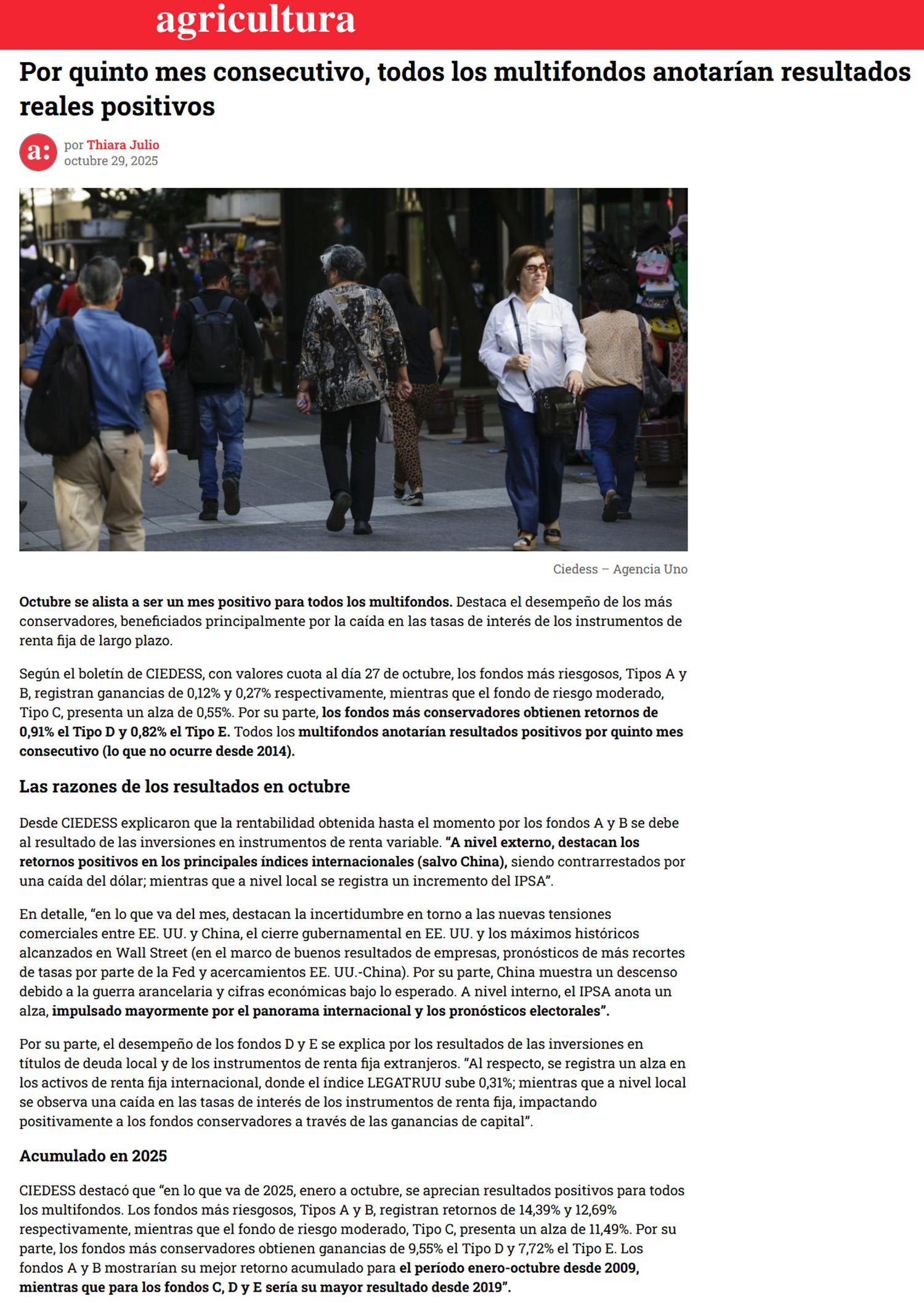 Fuente: Radio AgriculturaPublicado el 29 de octubre de 2025.Septiembre fue un mes positivo para todos los multifondos. Destaca el desempeño de los más riesgosos, beneficiados por el avance de la renta variable, tanto local como extranjera.