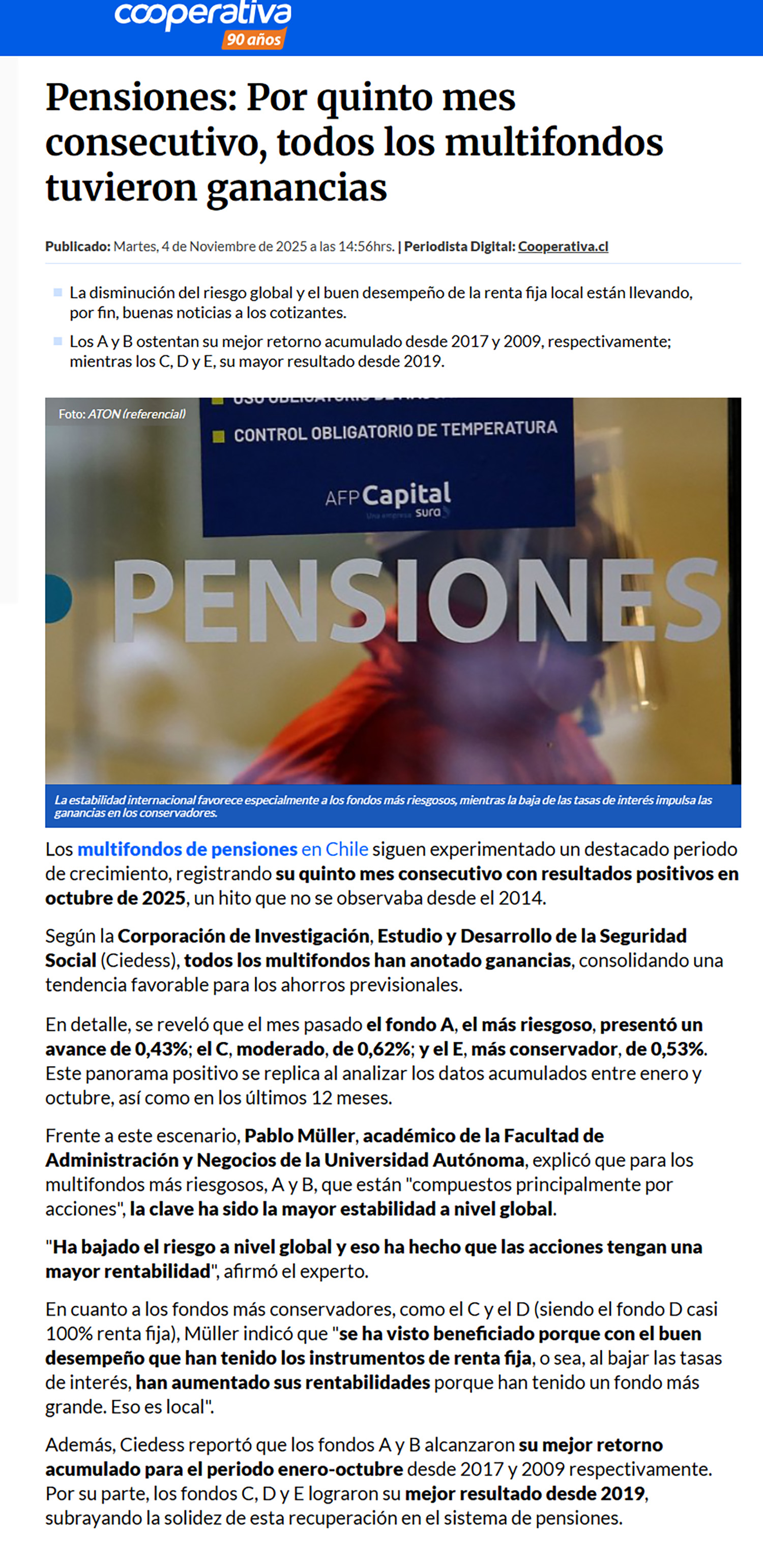 Fuente: Radio CooperativaPublicado el 04 de noviembre de 2025.- La disminución del riesgo global y el buen desempeño de la renta fija local están llevando, por fin, buenas noticias a los cotizantes.