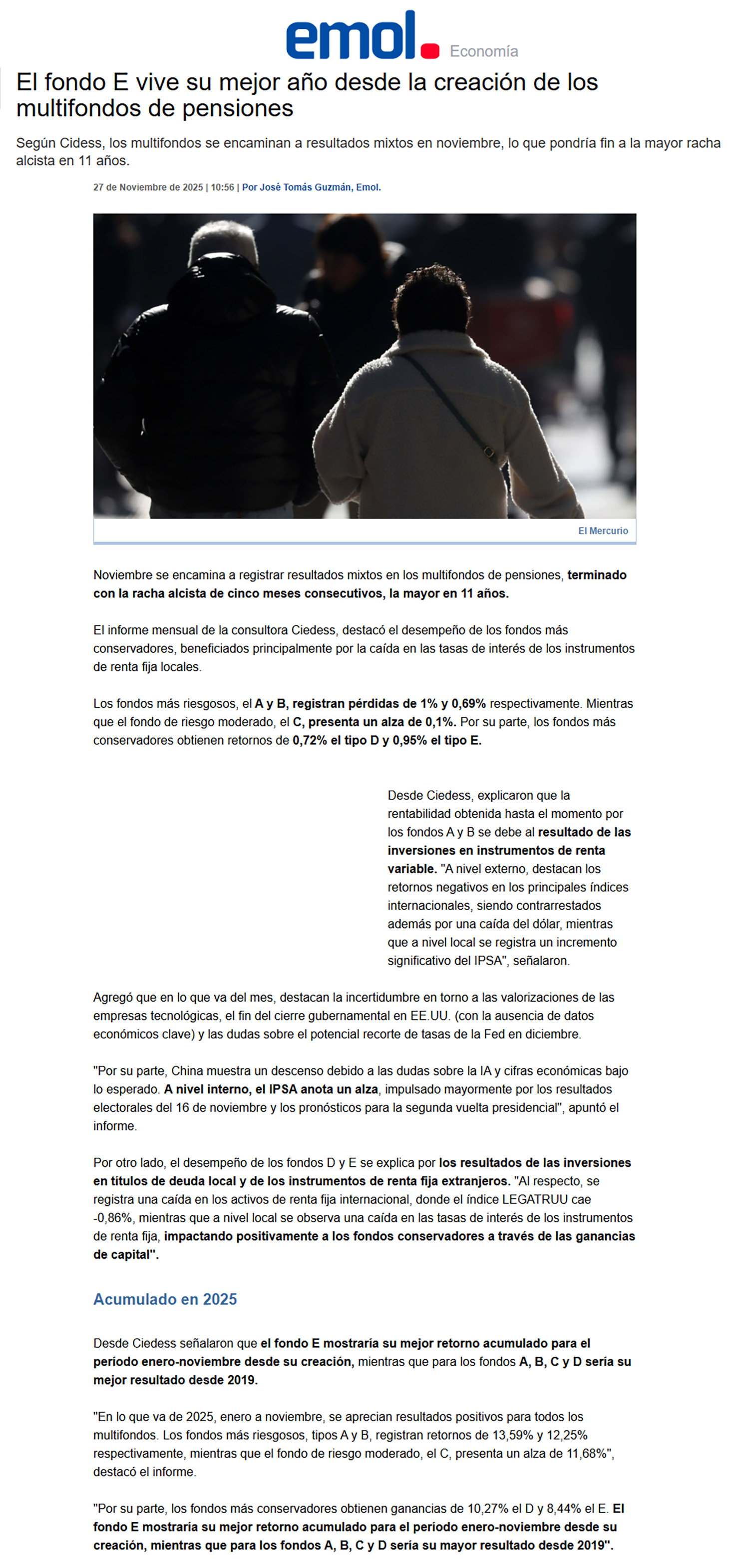 Fuente: EmolPublicado el 27 de noviembre de 2025.Noviembre se encamina a registrar resultados mixtos en los multifondos de pensiones, terminado con la racha alcista de cinco meses consecutivos, la mayor en 11 años.