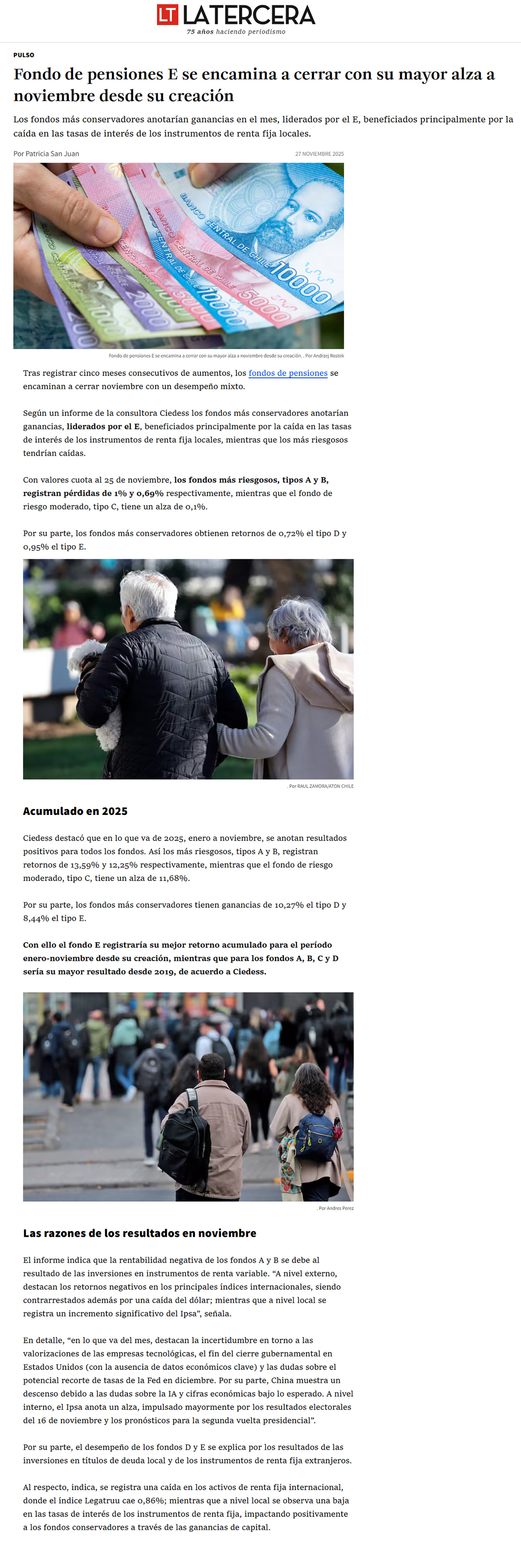 La Tercera Pulso: Fondo de pensiones E se encamina a cerrar con su mayor alza a noviembre desde su creación